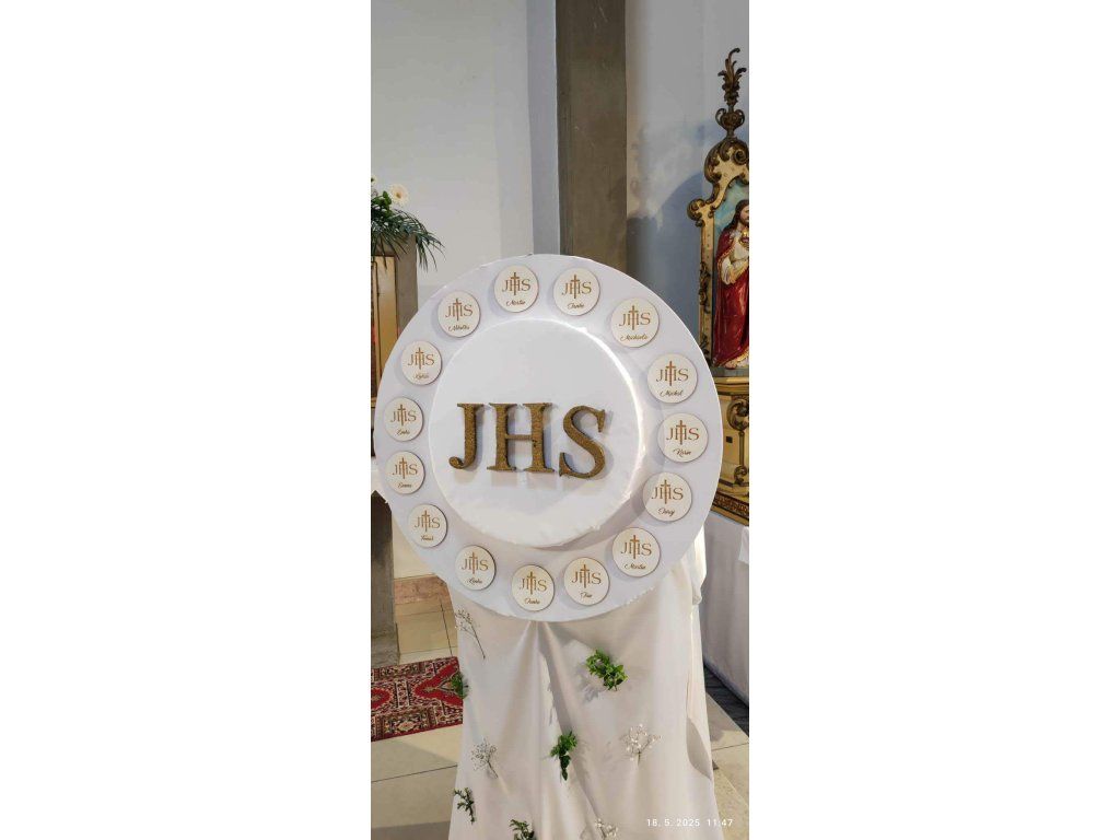 Hľadáte jemnú a vkusnú dekoráciu na prvé sväté prijímanie? Naša ručne maľovaná drevená hostia s gravírovaním JHS je ideálnym doplnkom na slávnostný stôl, do aranžmánov alebo ako pamiatka.