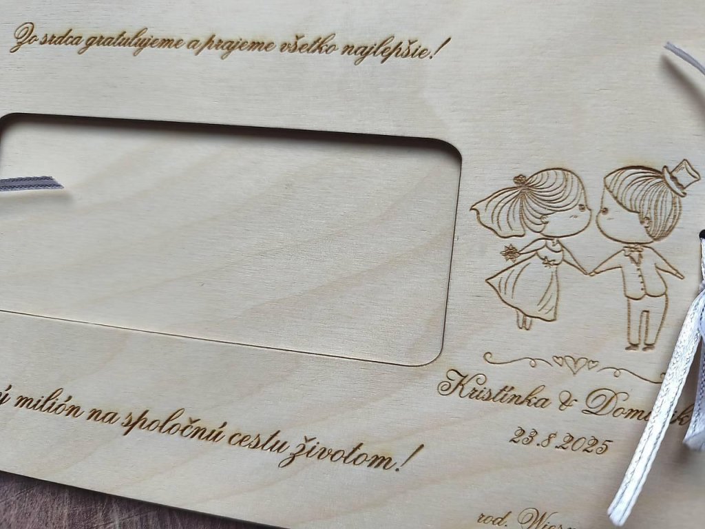 - Personalizácia na mieru: Na obálku vám vygravírujeme mená novomanželov a dátum ich svadby, čím sa darček stáva neopakovateľným.