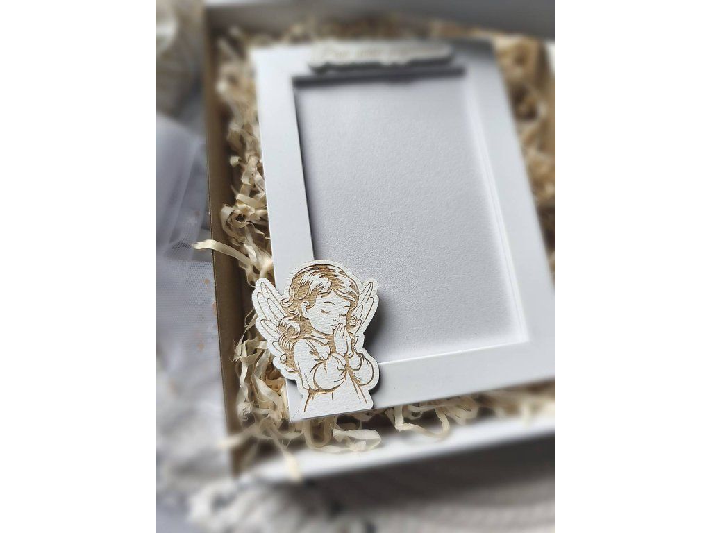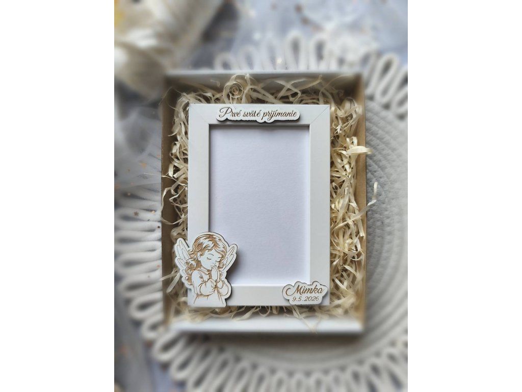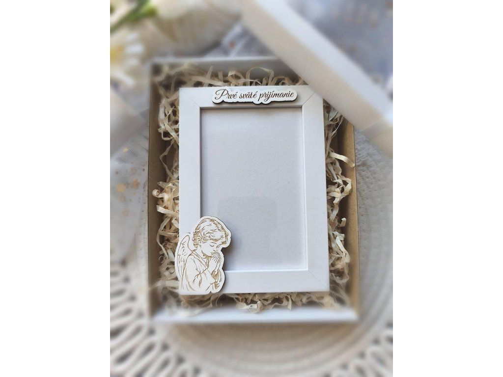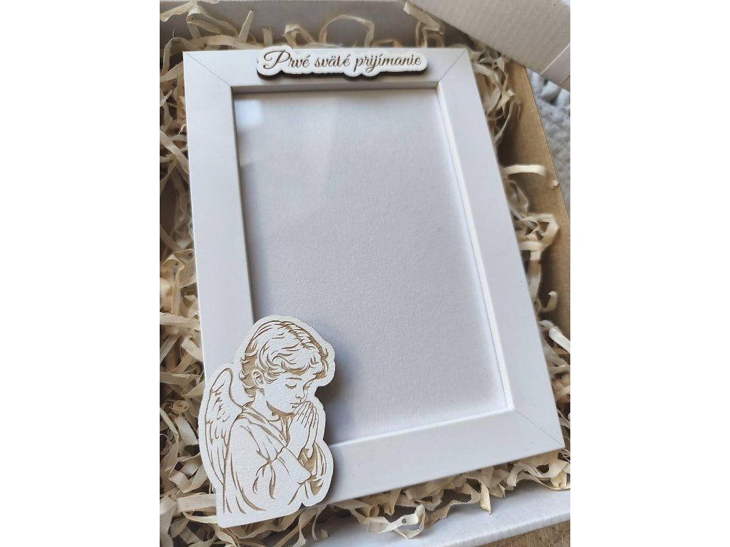 Tento biely fotorámik sme pre vás doplnili o drevené detaily z našej dielne Pre potešenie. Dominantou je precízne vyrezávaný a gravírovaný anjelik, ktorý symbolizuje čistotu a ochranu, doplnený o vkusný nápis "Prvé sväté prijímanie".
